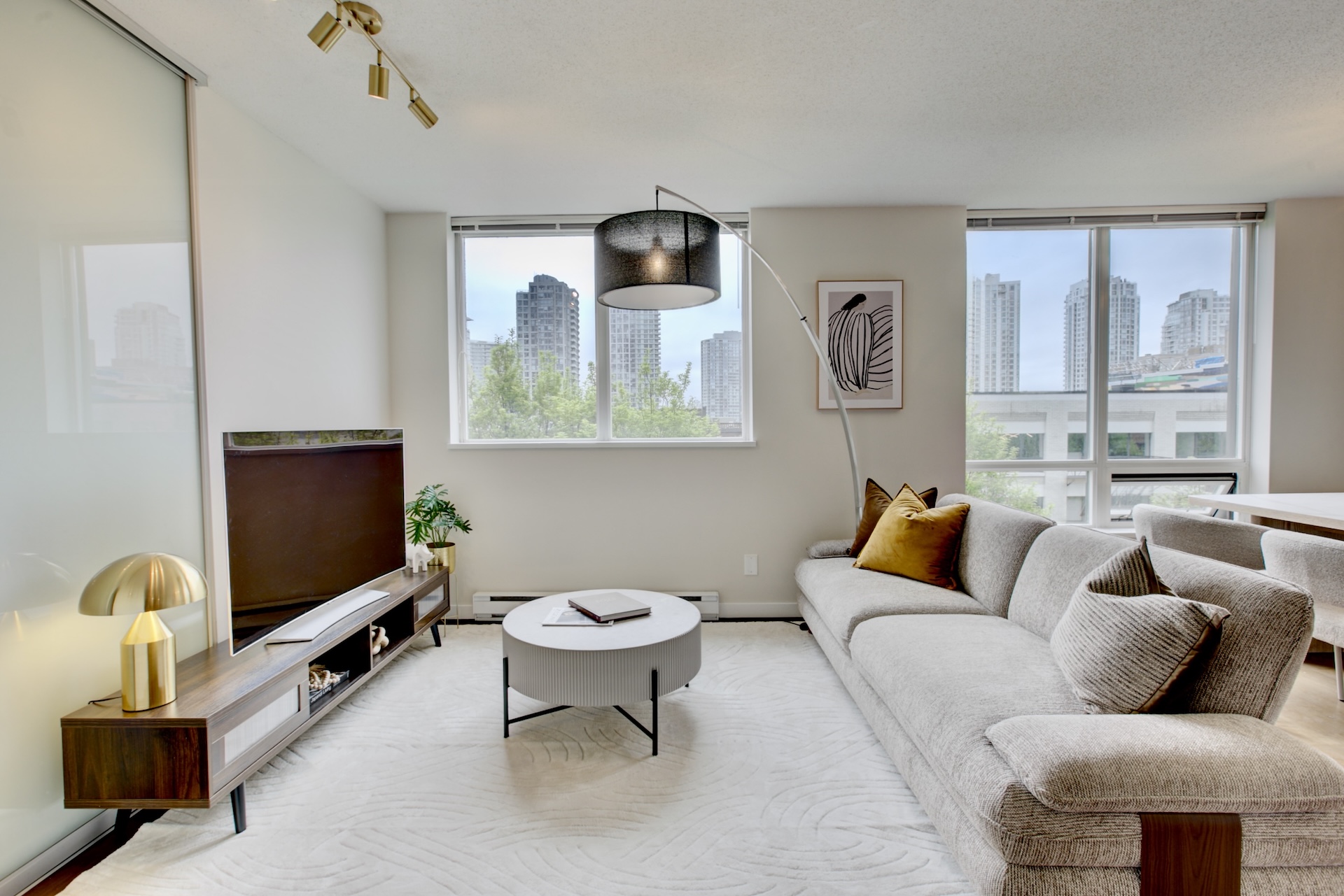Welcome to this beautifully furnished residence at 1055 Homer Street, ideally situated just steps from the vibrant energy of Yaletown. This stylish Unit 504 offers approximately 1,024 sq. ft. of thoughtfully designed living space, delivering both comfort and modern sophistication.